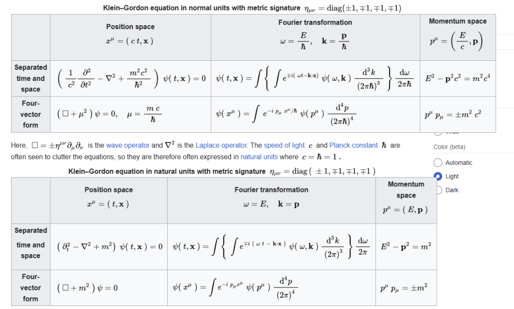 The Klein–Gordon equation can be written in different ways. The equation itself usually refers to the position space form, where it can be written in terms of separated space and time components ( t,x ) or by combining them into a four-vector xμ=( c t,x ) .